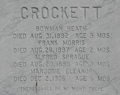 | Burial | He was buried in the Peoples Cemetery, Summerside, Prince County, Prince Edward Island, Canada, 46.40489, -63.77677G. Inscription: CROCKETT / Herbert Reid Crockettt / Died 21 Feb., 1926 Age 59 years / His Wife / Annie Huestis / Died Nov. 26, 1900 Age 39 years / Also His Wife / A. Maude Arbing / Died Dec. 2, 1959 Age 84 years / He that overcometh shall inherit all thingsLeft: Carl E. Crockett / 1902 - 1970 / Laura B. Crockett / 1920 - 1993Right: Harold R. Crockett / 1895 - 1970 / His Wife / Elizabeth M. Lord / 1893 - 1975Back: CROCKETT / Bowman Heath / Died Aug. 31, 1892 Age 9 mos. / Frank Morris / Died Aug. 26, 1897 Age 2 mos. / Alfred Sprague / Died Aug. 20, 1899 Age 3 mos. / Marjorie Eleanor / Died Dec. 2, 1906 Age 6 mos. / There shall be no night there Footstones, Carl, Laura, Harold, Elizabeth.1 ![]() Tombstone, Herbert Reid Crockett (1867-1926), his first wife Annie Huestis (1861-1900), his second wife Maude Arbing (1875-1959), son by second marriage Carl Crockett (1902-1900), his wife Laura Campbell (1910-1993), son by first marriage Harold R. Crockett (1895-1970), his wife Elizabeth Lord (1893-1975), Herbert's children by first marriage Bowman Heath (1891-1892), Frank Morris (1897-1897), Alfred Sprague (1899-1899), Herbert's daughter by second marriage Marjorie Eleanor (1906-1906). People's Cemetery, Summerside, Prince County, Prince Edward Island, Canada. ![]() Front inscription detail. ![]() Left inscription detail. ![]() Right inscription detail. ![]() Back inscription detail. ![]() Footstone, Carl E. Crockett. ![]() Footstone, Laura Blanche Campbell, wife of Carl E. Crockett. ![]() Footstone, Harold R. Crockett. ![]() Footstone, Elizabeth M. Lord, wife of Harold R. Crockett. |