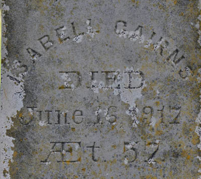 | Burial | She was buried in North Bedeque Cemetery, North Bedeque, Prince County, Prince Edward Island, Canada, 46.36227, -63.72524G. Inscription: Robert Cairns / Died / Oct. 30, 1903 / Æt. 80. / A native of / Dumfries, ScotlandLeft: In loving / remembrance / of / Isabella Stewart / Beloved wife of / Robert Cairns / Died / June 15, 1891, / Æt. 66.Right: Isabell Cairns / Died / June 16, 1917 / Æt. 57.1,3 ![]() Tombstone, Robert Cairns (1823-1903), his wife Isabella Stewart (1825-1891), their daughter Isabell Cairns (1860-1917). North Bedeque Cemetery, North Bedeque, Prince County, Prince Edward Island, Canada. ![]() Front inscription. ![]() Left inscription. ![]() Right inscription. |