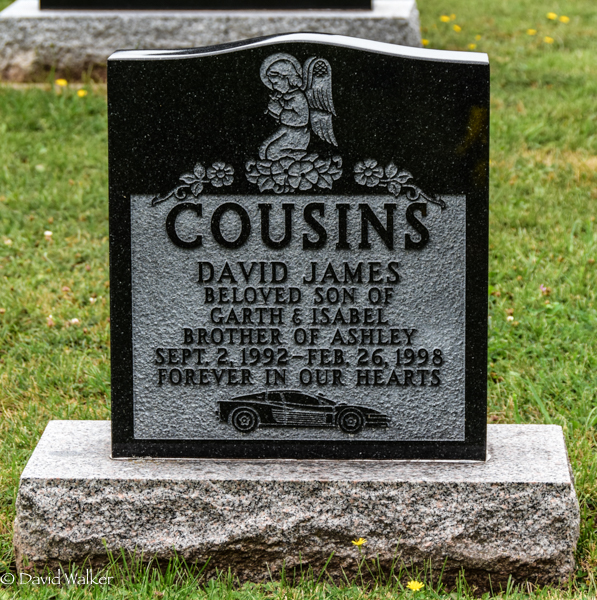 Inscription: COUSINS / David James / Beloved Son of / Garth & Isabel / Brother of Ashley / Sept. 2, 1992 - Feb. 26, 1998 / Forever in Our Hearts.1  Tombstone, David James Cousins (1992-1998). Peoples Cemetery, Summerside, Prince County, Prince Edward Island, Canada.