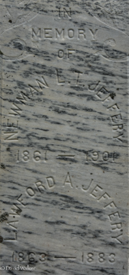 Inscription: In Memory of / Isaac J. Jeffery / 1828 - 1898 / His Wife / Louisa MacInnis / 1831 1901 / JEFFERYLeft: In / Memory / of / Newman L. Jeffery / 1861 - 1901 / Lawford A. Jeffery / 1863 - 1883Right: In Memory of / George Jeffery / 1792 - 1880 / His Wife / Hannah Bradshaw / 1794 - 1870Back: In / Memory / of / John A. Jeffery / 1869 - 1941.2  Tombstone, Isaac J. Jeffery (1828-1898), his wife Louisa MacInnis (1831-1901), their children Newman Jeffery (1861-1901), Lawford Jeffery (1863-1883), John Jeffery (1869-1941), Isaac's parents George Jeffery (1792-1880) and Hannah Bradshaw (1794-1870). St. John's Anglican Cemetery, St. Eleanors, Prince County, Prince Edward Island, Canada.  Left inscription detail.  Right inscription detail.  Back inscription detail.