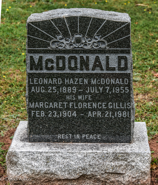 Inscription: McDONALD / Leonard Hazen McDonald / Aug. 25, 1889 - July 7, 1955 / His Wife / Margaret Florence Gillis / Feb. 23, 1904 - Apr. 21, 1981 / Rest in Peace.1  Tombstone, Leonard Hazen McDonald (1889-1955), his wife Margaret Florence Gillis (1904-1981). Peoples Cemetery, Summerside, Prince County, Prince Edward Island, Canada.