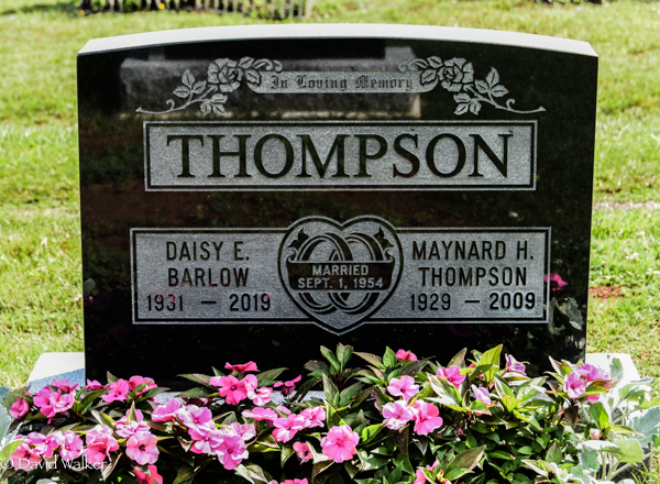 Inscription: THOMPSON / Daisy E. / Barlow / 1931 - 2019 | Married / Sept. 1, 1954 | Maynard H. / Thompson / 1929 - 2009.3  Tombstone, Maynard H. Thompson (1929-2009), his wife Daisy E. Barlow (1931-2019). Peoples Cemetery, Summerside, Prince County, Prince Edward Island, Canada.