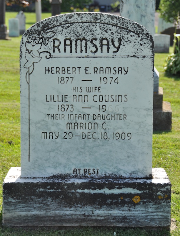 | Burial | She was buried in the Peoples Cemetery, Malpeque, Prince County, Prince Edward Island, Canada, 46.53019, -63.687760G. Inscription: RAMSAY / Herbert E. Ramsay / 1877-1974 / His Wife / Lillie Ann Cousins / 1873-1966 / Their infant daughter / Marion C. / May 29 - Dec. 18, 1909 / At Rest.5 Tombstone, Herbert E. Ramsay (1877-1974), his wife Lillie Ann Cousins (1873-1966), their daughter, Marion C. Ramsay (1909-1909), Peoples Cemetery, Malpeque, Prince County, Prince Edward Island. |