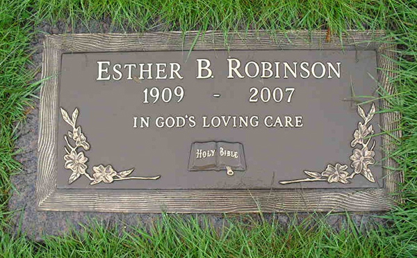 Inscription Front: Esther B. Robinson / 1909 - 2007 / In God's Loving Care.1  Tombstone, Esther Bell (Olson) Robinson (1909-2007). Forest Lawn Memorial Park, Burnaby, British Columbia, Canada. Photo courtesy of findagrave.com.