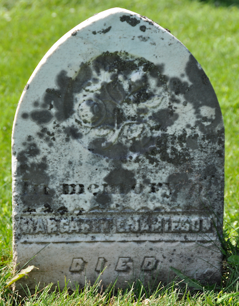 Inscription: In memory of / Margaret E. Jamieson / Died / June 9, 1867 (rest below ground).2  Tombstone, Margaret E. Jamieson (c.1852-1867). Protestant/United Cemetery, North Bedeque, Prince County, Prince Edward Island, Canada.