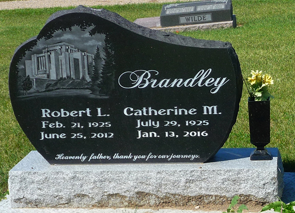 Inscription Front: BRANDLEY / Robert L. / Feb. 21, 1925 / June 25, 2012 | Catherine M. / July 29, 1925 / Jan. 13, 2016 / Heavenly father, thank you for our journeys.1  Tombstone, Robert L. Brandley (1925-2012), his wife, Catherine Marie Grunewald (1925-2016). Temple Hill Cemetery, Raymond, Lethbridge Census Division, Alberta, Canada. Photo courtesy of findagrave.com.