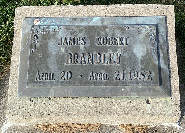 Inscription Front: James Robert / Brandley / April 20 - April 21, 1952.1  Tombstone, James Robert Brandley (1952-1952). Temple Hill Cemetery, Raymond, Lethbridge Census Division, Alberta, Canada. Photo courtesy of findagrave.com.