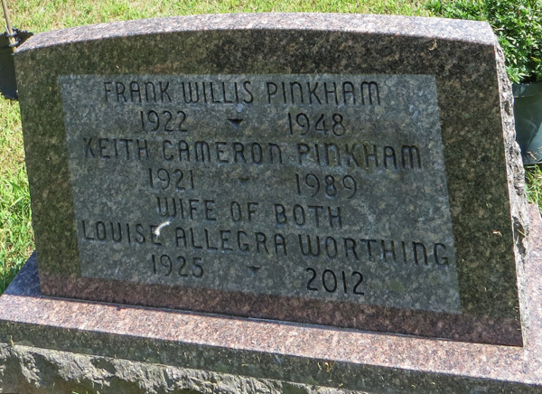 Inscription Front: Frank Willis Pinkham / 1922 - 1948 / Keith Cameron Pinkham / 1921 - 1989 / Wife of Both / Louise Allegra Worthing / 1925 - 2012.7  Marker, Frank Willis Pinkham (1922-1948), his brother Keith Cameron Pinkham (1921-1989), Louise Allegra Worthing (1925-2012), wife of both. Oak Hill Cemetery, Windsor, Maine, U.S.A. Photo courtesy of findagrave.com.