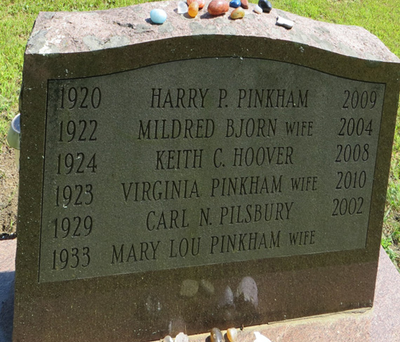 Inscription Front: 1920 Harry P. Pinkham 2009 / 1922 Mildred Bjorn Wife 2004 / 1924 Keith C. Hoover 2008 / 1923 Virginia Pinkham Wife 2010 / 1929 Carl N. Pilsbury 2002 / 1933 Mary Lou Pinkham Wife Back: PINKHAM / HOOVER / PILSBURY.5  Marker, Harry Pierce Pinkham (1920-2009) family plot. Photo courtesy of findagrave.com.