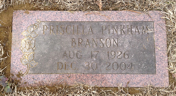 Inscription Front: Priscilla Pinkham / Branson / Aug. 17, 1926 / Dec. 30, 2004.11  Marker, Priscilla Pinkham (1926-2004). Oak Hill Cemetery, Windsor, Maine. Photo courtesy of findagrave.com.