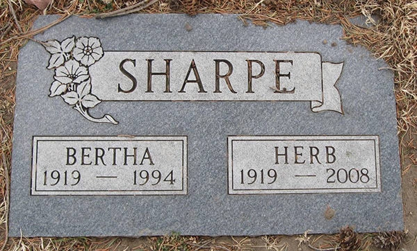 Flatstone Inscription: SHARPE / Bertha / 1919 - 1994 | Herb / 1919 - 2008.4  Cemetery Marker - Herbert A. Sharpe (1919-2008) & Bertha Stewart (1919-1994). Highland Cemetery, Great Falls, Cascade County, Montana, U.S.A. Photo courtesy of Find a Grave.