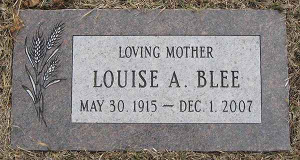 Inscription Front: Loving Mother / Louise A. Blee / May 30, 1915 - Dec. 1, 2007.1  Marker, Louise A. Wilkinson (1915-2007). Highland Cemetery, Great Falls, Cascade County, Montana, U.S.A. Photo courtesy of findagrave.