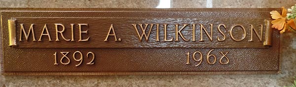 Inscription Front: Marie A. Wilkinson / 1892 - 1968.1  Marker, Marie Ann (Sharpe) Wilkinson (1892-1968). (1923-1973). Hillcrest Lawn Cemetery, Great Falls, Montana, U.S.A. Photo courtesy of findagrave.com.