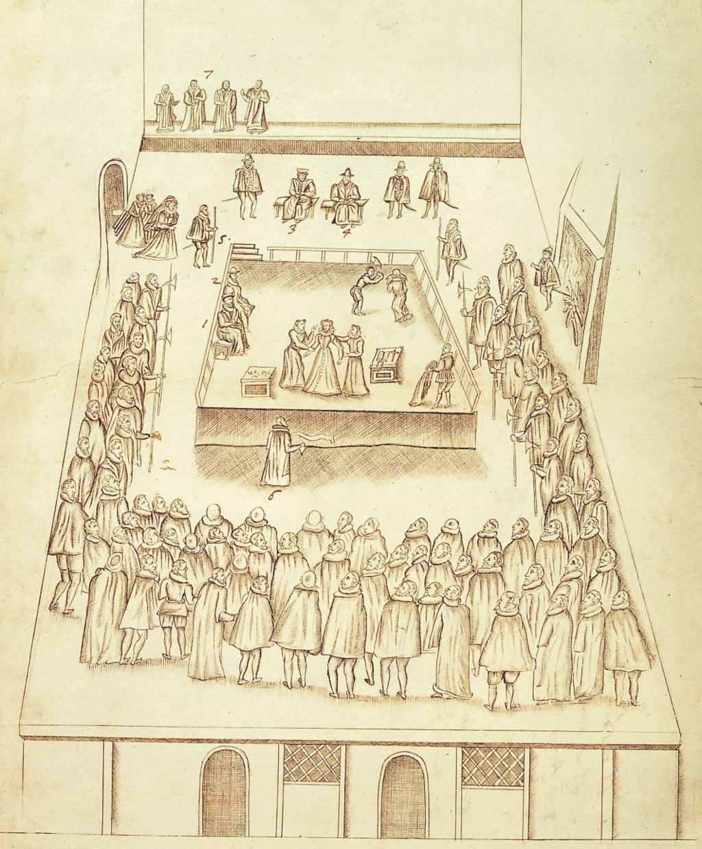 | Witness | He witnessed the death of Mary Stuart, Queen of Scots, on 8 February 1587 in Fotheringhay Castle, Northamptonshire, England, 52.52455, -0.43757G.3,4,5 The execution scene of Mary Stuart, drawn by eyewitness Robert Beale. One of the official witnesses was George Talbot, 6th Earl of Shrewsbury, seated at left on the scaffold. He is identified as Number 1. Courtesy of Wikipedia.  Execution of Mary Queen of Scots, 8 February 1587, at Fotheringhay Castle, watercolour, artist unknown. After nineteen years in prison, she was found guilty of plotting the assassination of her cousin, Queen Elizabeth I, who ordered the execution. Source: National Portrait Gallery, London. Mary's clothes were burned to prevent her supporters from keeping them as relics, and this scene is shown on the left.  The moat and site of Fotheringhay Castle site, seen from across the River Nene, Northamptonshire, England. |