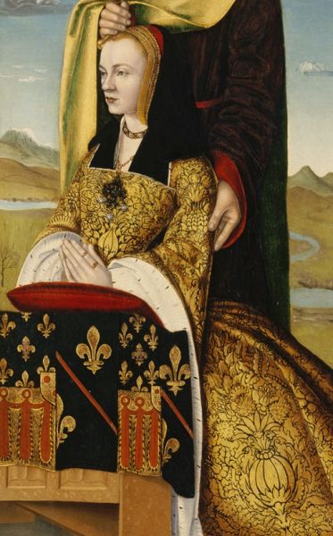 Anne of France, Duchess of Bourbon. Detail from The Moulins Triptych by Jean Hey, c. 1498. Courtesy of Wikipedia.